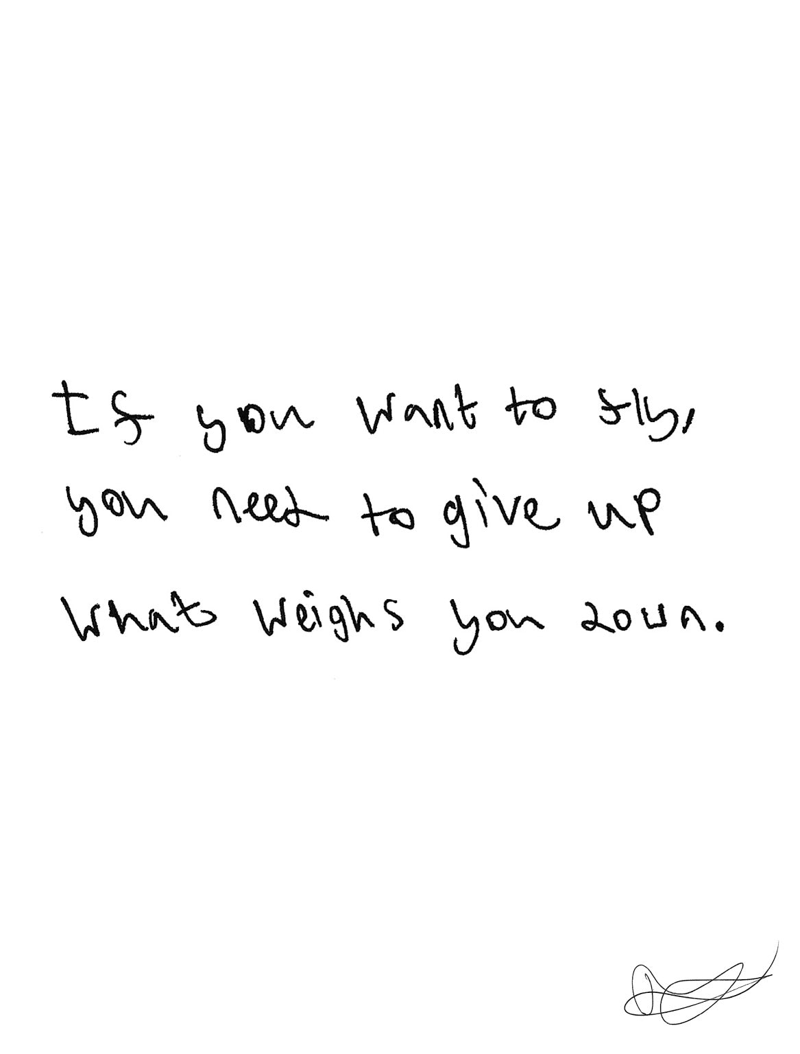 - "If you want to fly, you need to give up what weighs you down." script print on left chest