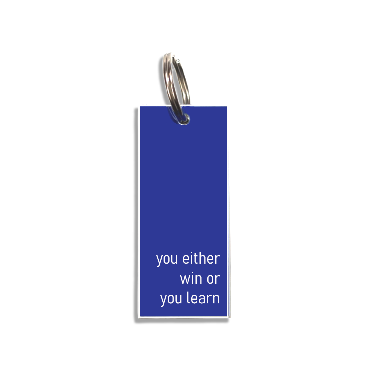 Blue keyring with white text
